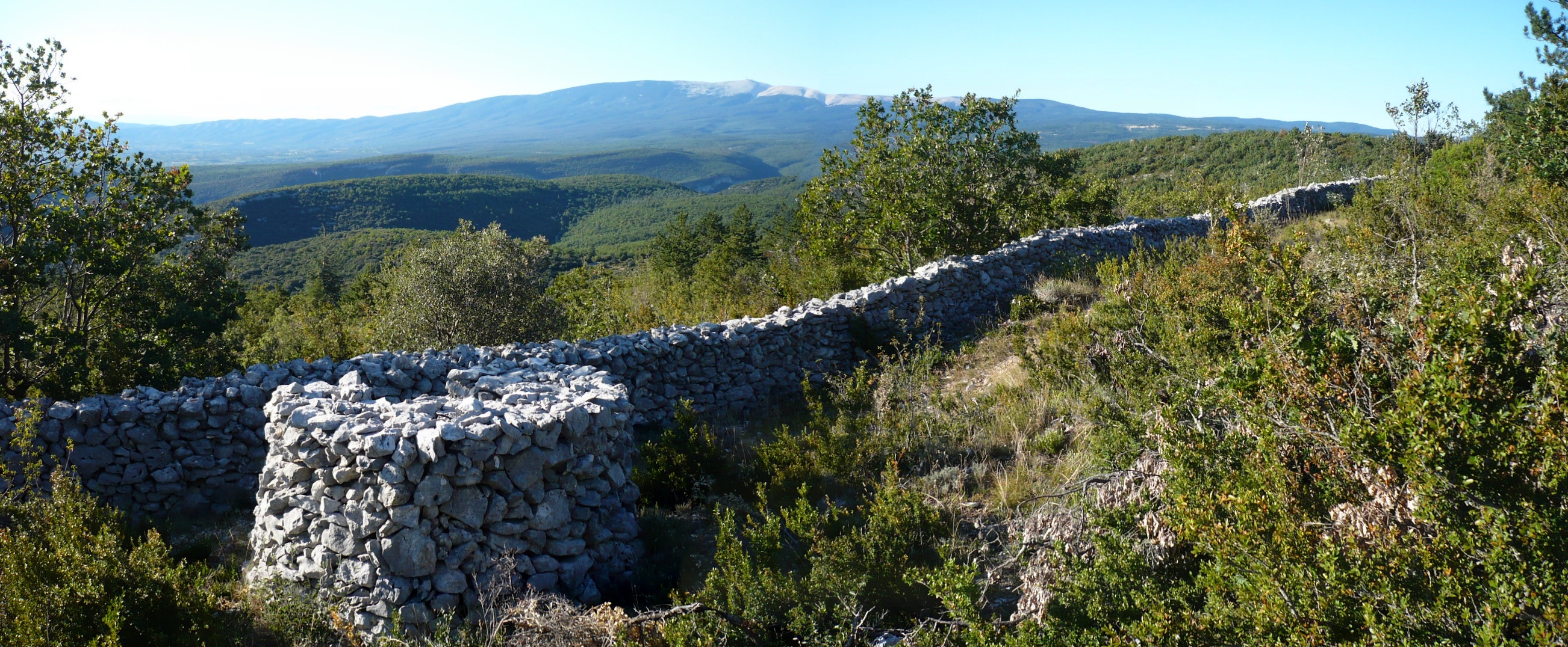 Il panorama che si apre sui monti del Vaucluse in direzione del Ventoux. In primo piano, una garitta davanti al muro della peste - Foto © Lacaille