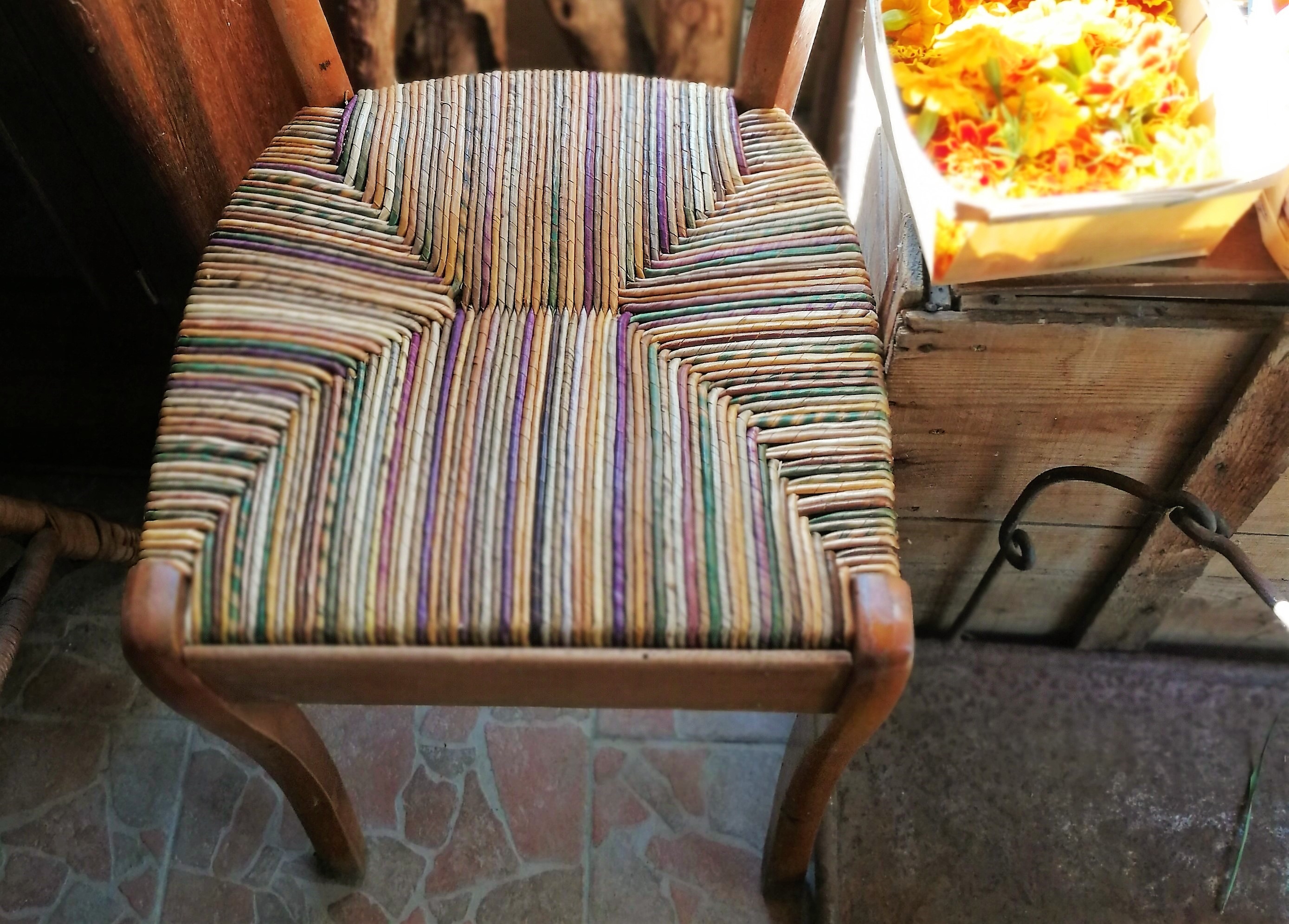 Pastellière d'un jour, una sedia impagliata con le fibre multicolori